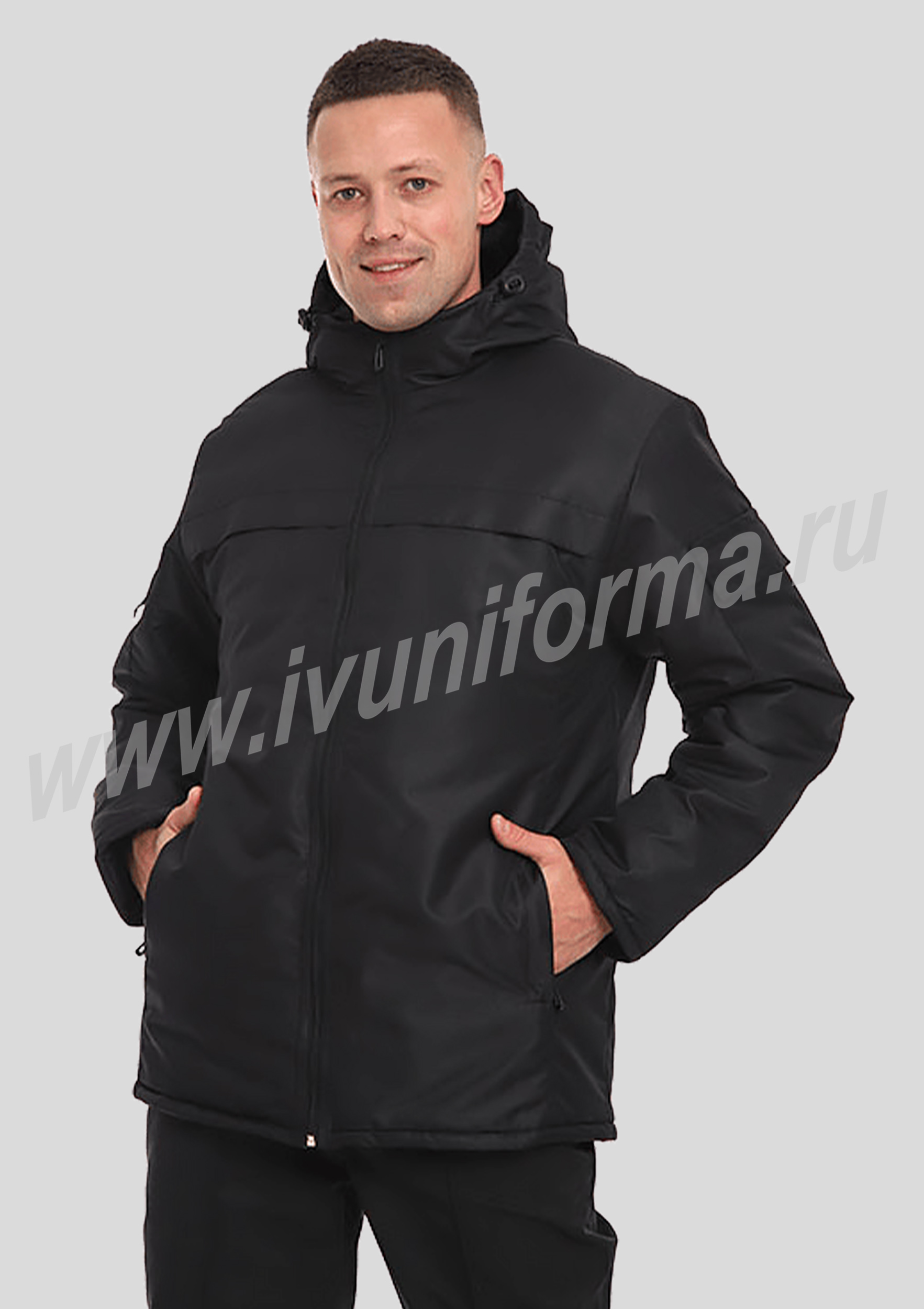 Куртка демисезонная мужская, легкая и очень удобная. Куртка прямая на молнии с ветрозащитным клапаном, со стойкой переходящей в капюшон. Полочка и спинка с отрезными кокетками. На полочке, вдоль рельефа, два кармана на молнии. По низу куртки утягивающая кулиса с ограничителями. Рукава куртки двухшовные, на трикотажных манжетах. На подкладке два кармана под молнию. Куртка предназначена как для повседневной носки на предприятиях так и для сотрудников охранных структур.
